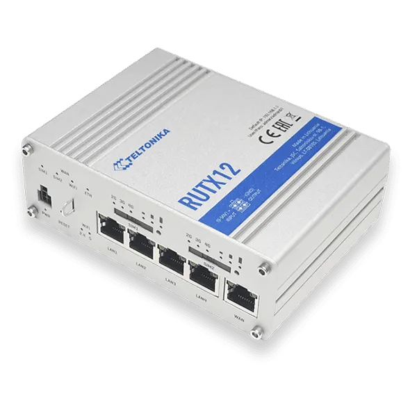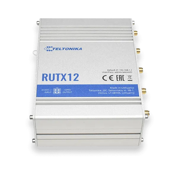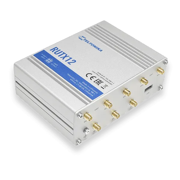 | Комплектация | 4G LTE-роутер Teltonika RUTX12 / LTE антенна, 4 шт. / Wi-Fi антенна, 2 шт. / GNSS антенна / Bluetooth антенна / Игла для извлечения SIM-карты / Блок питания / Кабель Ethernet 1,5 м / Руководство по быстрому старту |