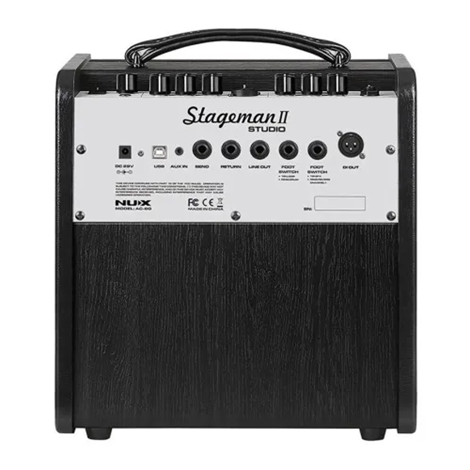 Nux AC-60 позволяет подключить гитару и микрофон для усиления звука. Выходы устройства подходят для студийной записи или сценического исполнения. Прибор Nux AC-60 оснащен 6,5 дюймовым динамиком. Модель поставляется со свитчом NMP-2 для драм машины. Оборудование Nux AC-60 поддерживает 12 эффектов. Имеется лупер на 1 минуту.
