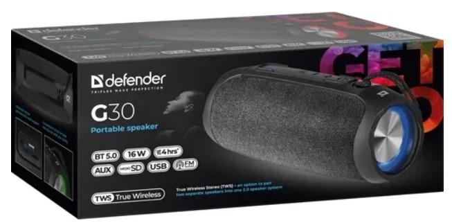 Акустическая система Defender G30 изготавливается со стильным современным дизайном. Окрашена в черный матовый цвет. Встроена светодиодная подсветка. Предусмотрена батарея с емкостью 2400 мА/ч. Для подключения имеется как беспроводной Bluetooth модуль, так и классический аналоговый порт 3.5 мм. Заряжается по кабелю USB. Имеется слот под карты памяти типа MicroSD.