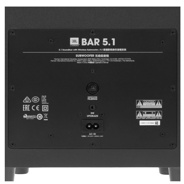 Акустическая система JBL Bar 5.1 изготавливается с компактными габаритами. Подразумевает установку на слоты и тумбы. Имеет корпус из практичного пластикового полимера. Окрашивается матовой черной краской. Предусмотрено подключение по беспроводной сети Bluetooth. Обладает нескольким цифровыми интерфейсами типа HDMI. Предельный уровень выходной мощности составляет 510 Вт.