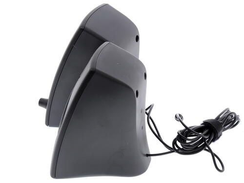 Акустическая система выполнена в сдержанном элегантном дизайне черного цвета. Необычный вид моделям придает их слегка изогнутая форма. Колонки органично впишутся в рабочее и домашнее пространство, поэтому их можно разместить рядом с универсальным ПК на столе. Подключение колонок к компьютеру производится через интерфейс 3.5 мм. Питание устройств ведется через блок питания от электросети. На корпусе правой колонки размещен регулятор уровня громкости, разъем для подключения наушников и светодиодный индикатор.