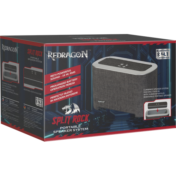 Акустическая система Redragon Split Rock представляет собой 2.1 аудиосистему общей мощностью 16 Вт для прослушивания музыки любого жанра. Аудиосистема состоит из 2 модулей — стационарный сабвуфер на 10 Вт и отдельная портативная колонка с батареей на 1050 мА ч. Система имеет Bluetooth 4.1 и AUX вход для любого источника. У Redragon Split Rock современный дизайн, который впишется в любой интерьер.