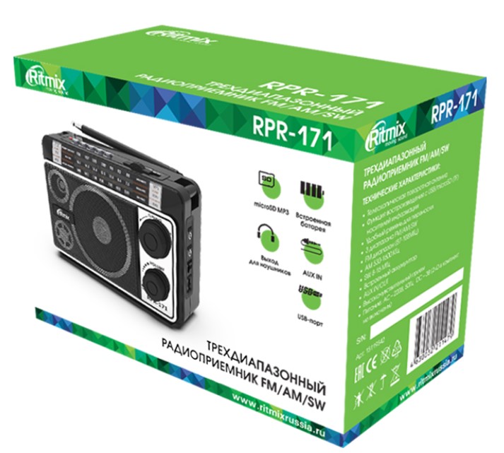 | Комплектация | Радиоприемник портативный Ritmix RPR-171 / Кабель питания - 1 шт. / Ремень для переноски - 1 шт. / Документация |