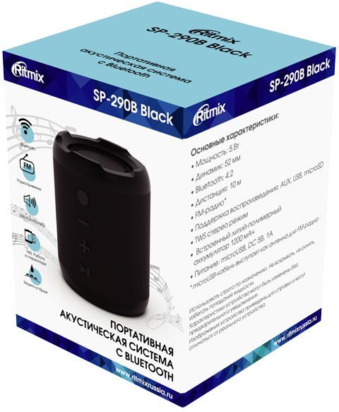 Портативная колонка Ritmix SP-290B благодаря Bluetooth-соединению подключится к любому мобильному устройству в радиусе 10 метров и будет проигрывать вашу любимую музыку. Благодаря мощности динамика в 5 Вт вы получаете качественное и чистое звучание треков в любой обстановке. Колонка оснащена FM-приемником. Вы можете слушать музыку с USB-накопителя. Зарядка аккумулятора проводится через порт USB. Мощный аккумулятор на 1200 мА*ч обеспечивает длительную работу без подзарядки.