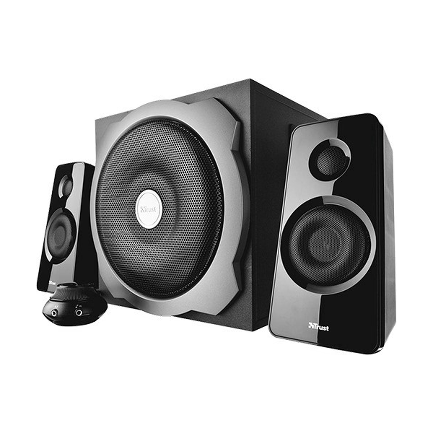 | Комплектация | Колонки Trust Tytan / Сабвуфер с силовым кабелем / Руководство пользователя / Проводной пульт дистанционного управления |