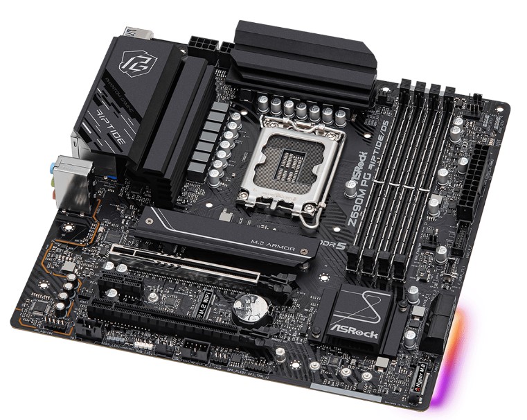 Системная плата ASRock Z690M PG Riptide/D5 изготавливается с уменьшенным форматом. Подходит для небольших Mid Tower корпусов. Предусмотрено массивное металлическое охлаждение горячих компонентов. Имеются разъемы SATA и M.2 для разнообразных накопителей. Встроен усиленный порт PCI Express 5.0 для мощных видеоадаптеров.