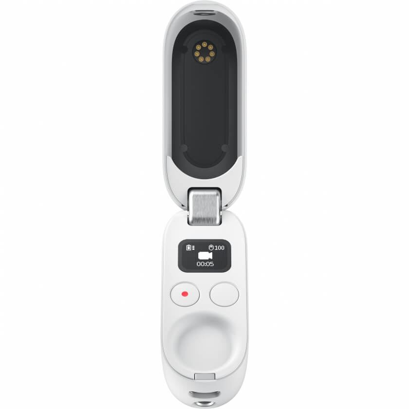 Зарядный кейс Insta360 GO 2 Charge Case представляет собой небольшое устройство для экшн-камеры, с помощью которого вы сможете ее подзарядить. Благодаря особой конструкции с раскладывающимися ножками кейс превращается в небольшой трипод. Вы сможете заряжать камеру и снимать видео. Внутри кейса размещен небольшой экран, на котором отображается, в каком режиме работает кейс и камера. Также зарядный кейс выполняет функцию пульта дистанционного управления камерой.