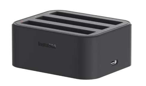 Зарядное устройство Insta360 ONE X2 Charge создано с удобными габаритами. изготовлено с простым дизайном. Подразумевает настольную установку. Содержит ряд небольших светодиодов у каждого разъема для контроля за текущим статусом батарей. Необходимо подключения стороннего адаптерам электропитания. Встроен современный двусторонний разъем формата USB-C. Максимальное время полной перезарядки составляет 110 минут.