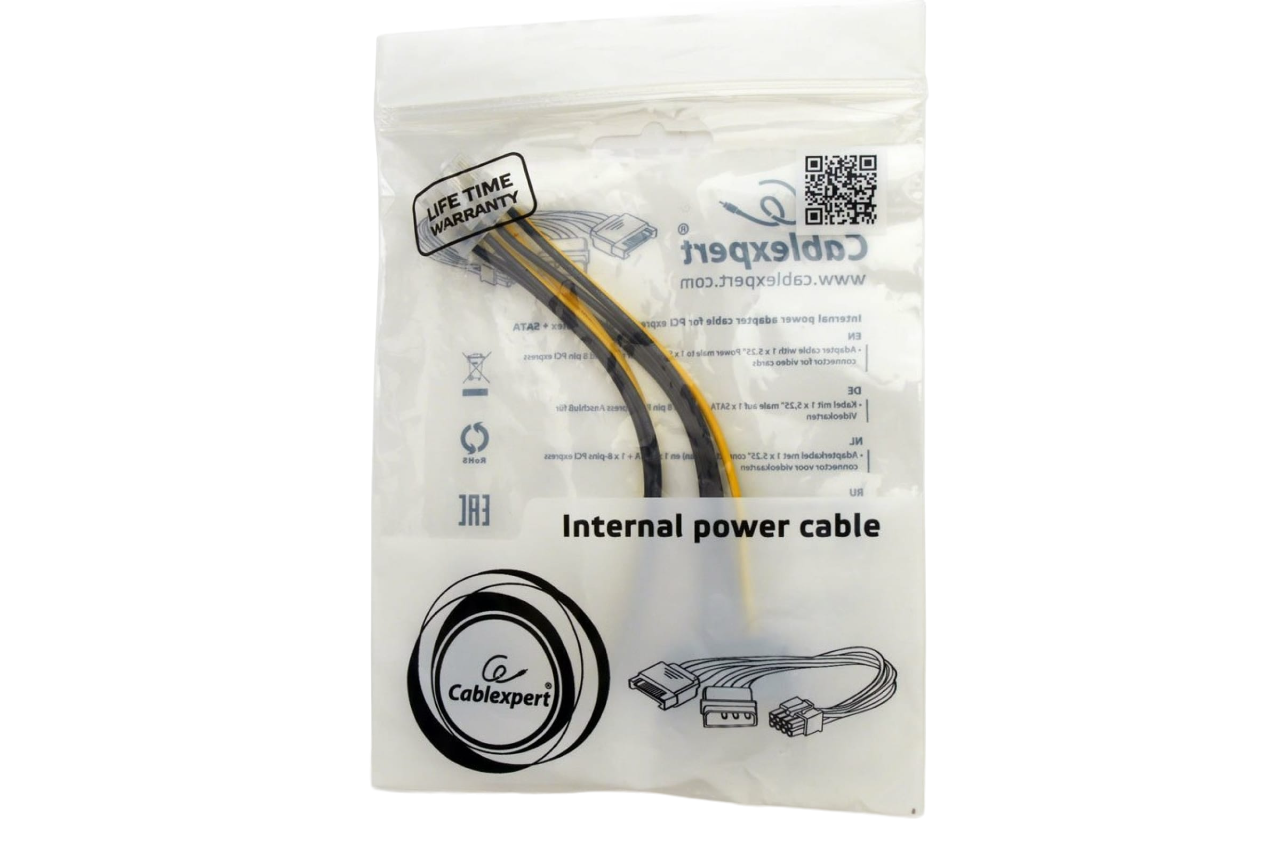 Кабель CC-PSU-82 от Cablexpert разработан для установки в системный блок новой более мощной видеокарты и организации ее электропитания от блока питания через коннекторы стандарта Molex или SATA. Используя разъемы питания для жестких дисков, вы сможете установить в компьютер видеокарту и подключить ее к уже действующему блоку питания без разъемов PCI-Express 8-pin. Переходник имеет длину 15 см и качественно выполнен. Кабель с плотной оплеткой рассчитан на долгий срок службы и обеспечивает стабильное электропитание видеокарты.