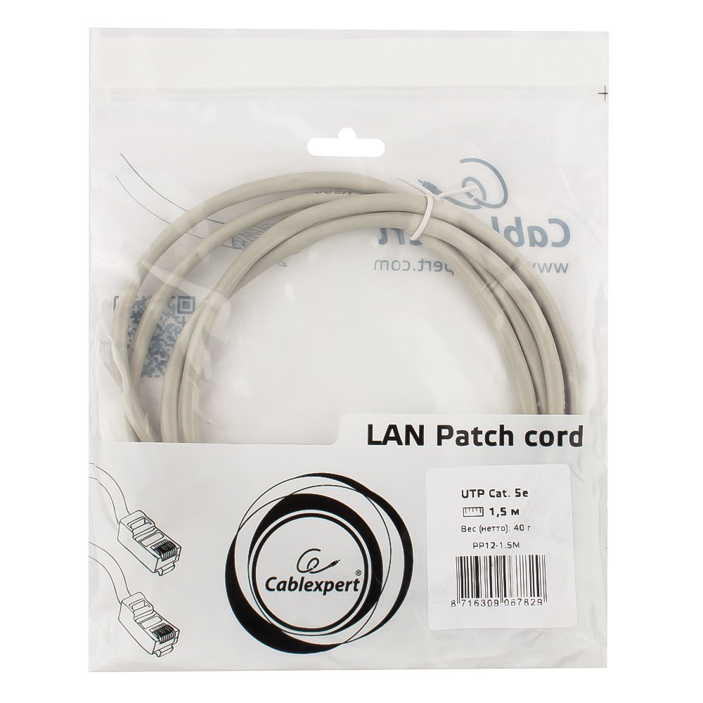 Патч-корд Cablexpert UTP 5e-Cat PP12-1.5M используется для подключения компьютерного оборудования к локальной сети или в системах телекоммуникаций. Кабель длиной 1.5 метра состоит из 8 проводов из меди, скрученных парами между собой, поэтому также называется витой парой. Внешняя оболочка выполнена из ПВХ серого цвета, обладает хорошей гибкостью и устойчивостью к внешним воздействиям. В структуре кабеля не предусмотрено дополнительное экранирование. На концах кабеля размещены коннекторы RJ-45 (8p8c).