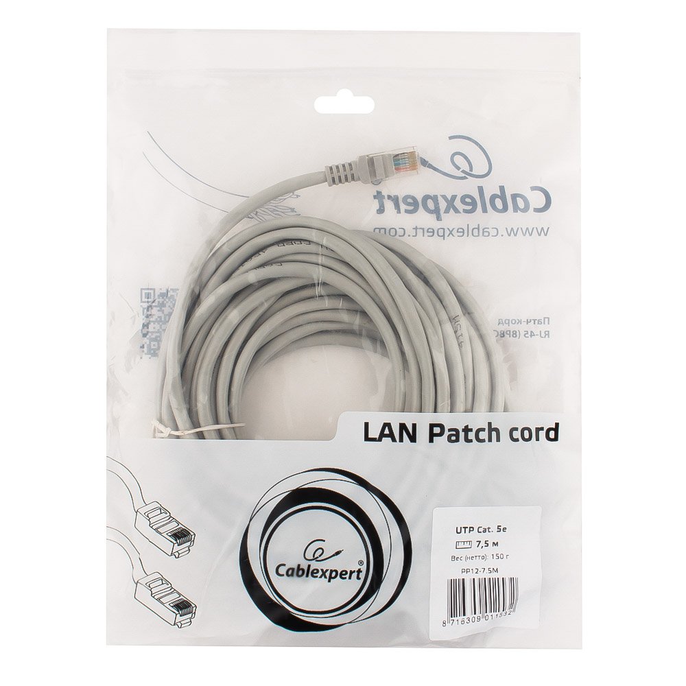 Кабель Cablexpert UTP 5e-Cat PP12-7.5M представляет собой долговечное и качественное устройство, применяемое для использования с разнообразными компьютерными системными блоками, серверными системами, оргтехникой и мультимедийными проигрывателями. Встроены два интерфейса типа RJ45 с позолоченными контактами. Обладает надежной синтетической изоляцией серого цвета. Соответствует стандарту 5е. Поставляется с длиной 7.5 метра.
