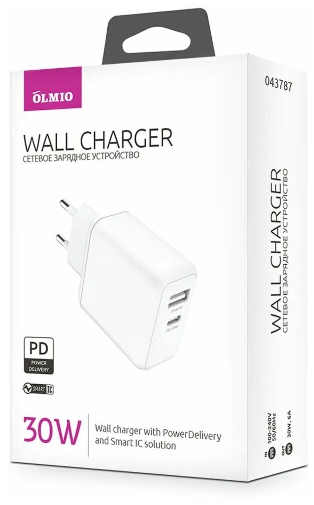 | Комплектация | Зарядное устройство сетевое Olmio PowerDelivery Type-C + USB 30W / Документация |