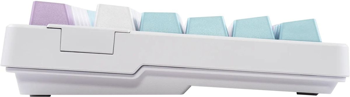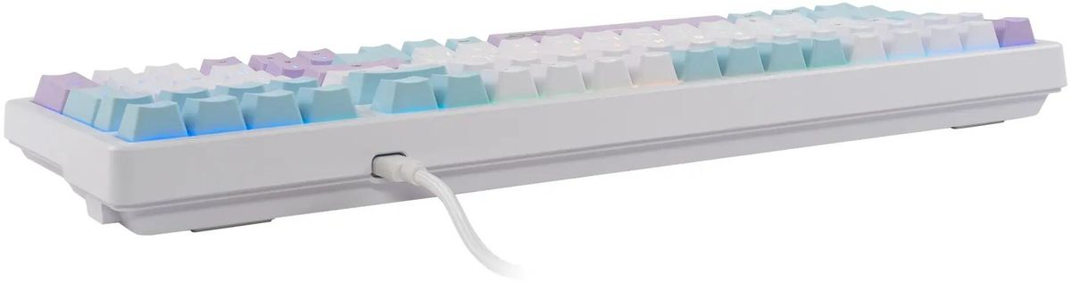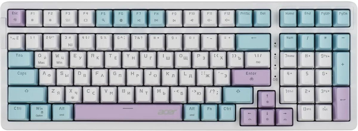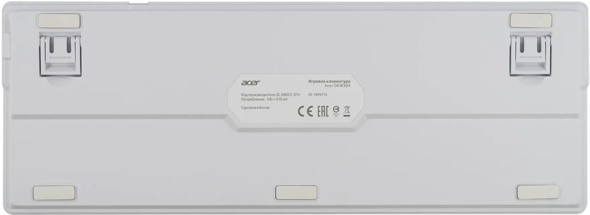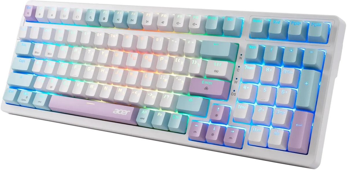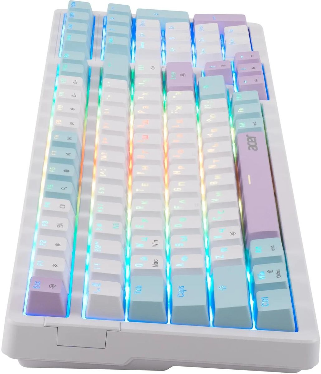 Корпус выполнен из пластика и оформлен в сочетании белого, голубого и фиолетового цветов, что подчёркивает игровой характер устройства. Клавиатура относится к классическому типу по толщине и рассчитана на настольное использование. В комплект поставки входят сама игровая клавиатура Acer ZL.KBDCC.01V, съёмный USB Type-C кабель и краткое руководство пользователя. Модель не требует автономного питания и работает напрямую от USB-подключения, обеспечивая простоту эксплуатации и надёжность в повседневном использовании
