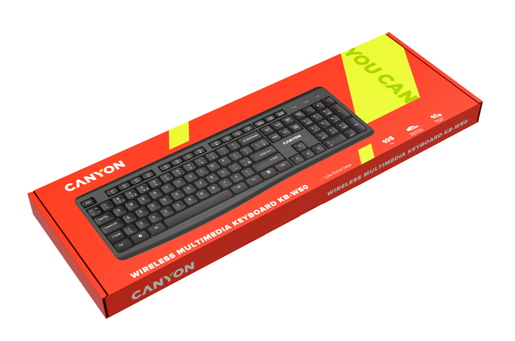 | Комплектация | Клавиатура Canyon KB-W50 / Нано USB-ресивер - 1 шт / Батарейки типа ААА - 2шт / Документация |