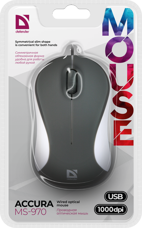Мышь Accura MS-970 от бренда Defender – небольшая проводная модель с эргономичной формой. У этой модели установлен высококачественный оптический сенсор с высоким разрешением. Этот показатель оптимально подходит для офисной работы и управления стандартными приложениями. Модель имеет приятное прорезиненное покрытие, поэтому идеально подходит для длительной работы за компьютером. Устройство небольших размеров не сложно перевозить с собой и использовать как альтернативу беспроводной мыши.