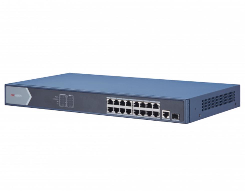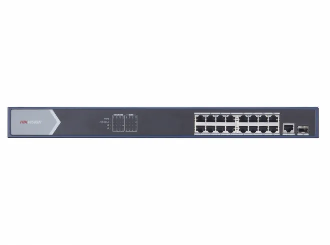 PoE-коммутатор Hikvision DS-3E0518P-E/M разработан для создания корпоративных локальных сетей с высокой скоростью обмена данными и рассчитан на подключение до 18 периферийных устройств. С помощью коммутатора вы сможете организовать систему видеонаблюдения или подключить компьютеры для обмена данными. На корпусе устройства есть 16 портов Gigabit с поддержкой электропитания PoE и 2 порта Gigabit SFP для оптоволоконных соединений. Модель поддерживает стабильную загрузку и обмен данными внутри сети на высокой скорости до 1000 Мб/сек.