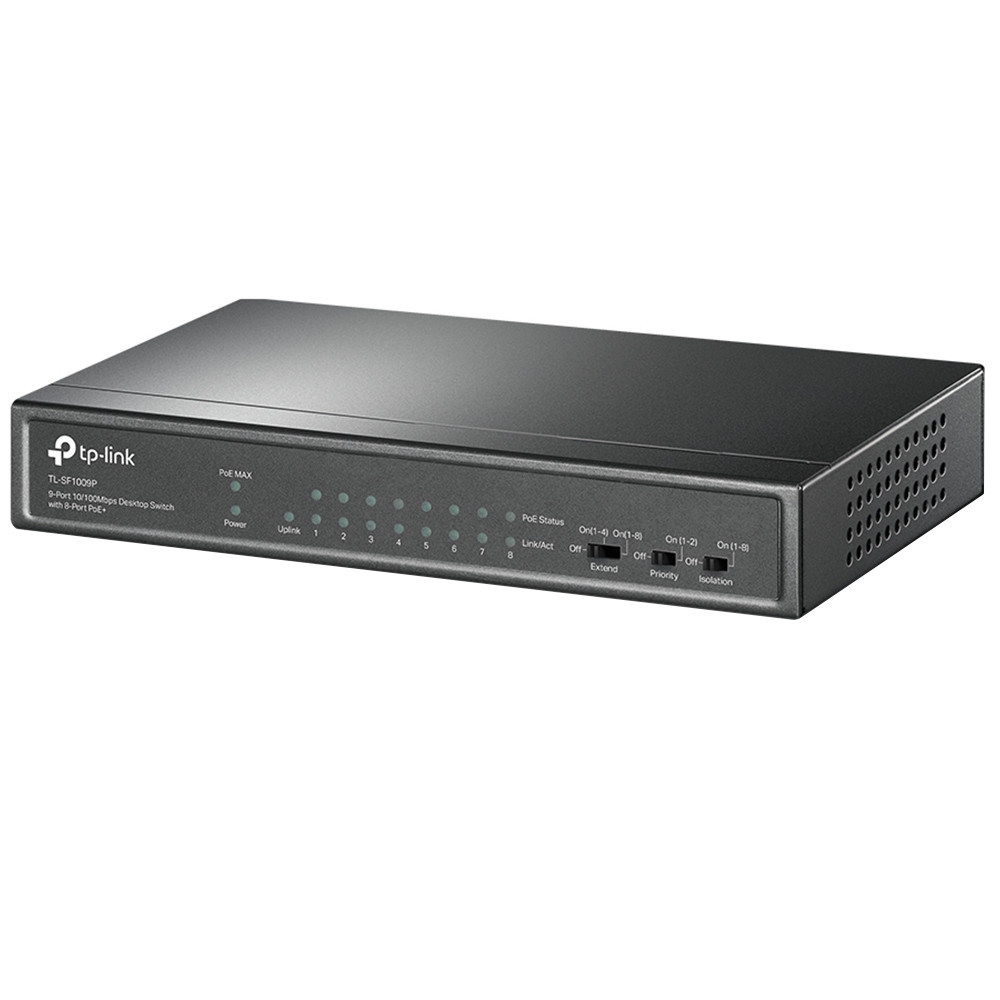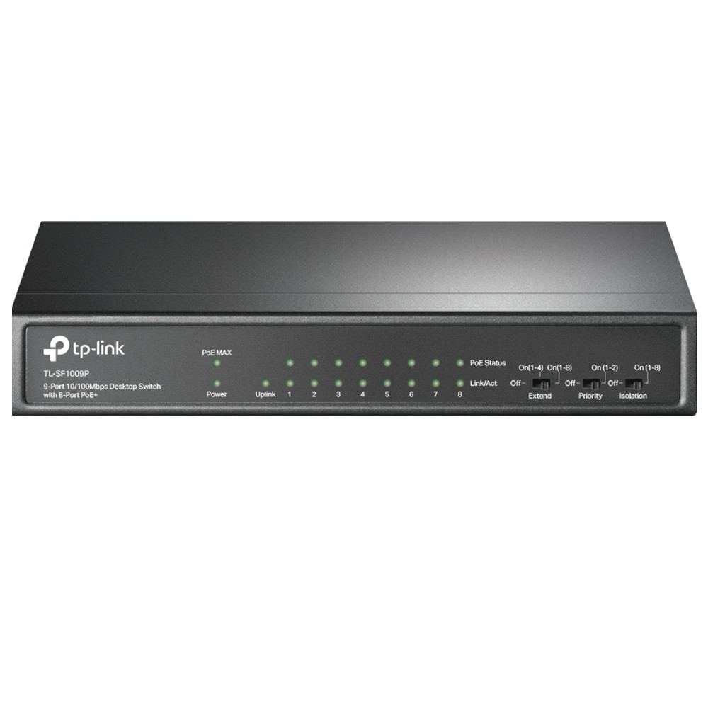 Коммутатор Tp-Link TL-SF1009P представляет собой небольшое, но мощное и функциональное устройство для объединения оборудования и компьютеров в единую локальную сеть, внутри которой вы сможете настроить процедуру обмена данными на высокой скорости. Коммутатор оснащен 9 портами, 8 из которых поддерживают технологию электропитания PoE в расширенном режиме. То есть при подключении к этим портам вы сможете не только подключить оборудование к созданной вами сети, но и обеспечить подачу электроэнергии. К таким портам можно подключать элементы системы видеонаблюдения и другое оборудование.