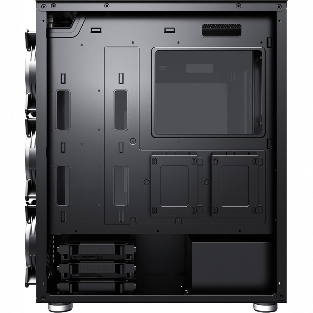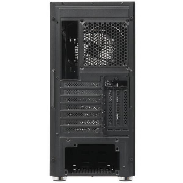 Корпус соответствует типоразмеру midiTower и рассчитан на подключение материнской платы разных форматов. В этой модели материнская плата устанавливается вертикально. Предельно допустимая длина видеокарты – 387 мм. Внутри предусмотрено 7 горизонтальных слотов для подключения различных устройств и 3 вертикальных слота. Для установки накопителей на 2,5 дюйма есть 5 отсеков. Кроме того, к системе можно подключить 3 накопителя на 3,5 дюйма. Корпус поставляется без блока питания. Для его установки предусмотрен отсек в нижней части.