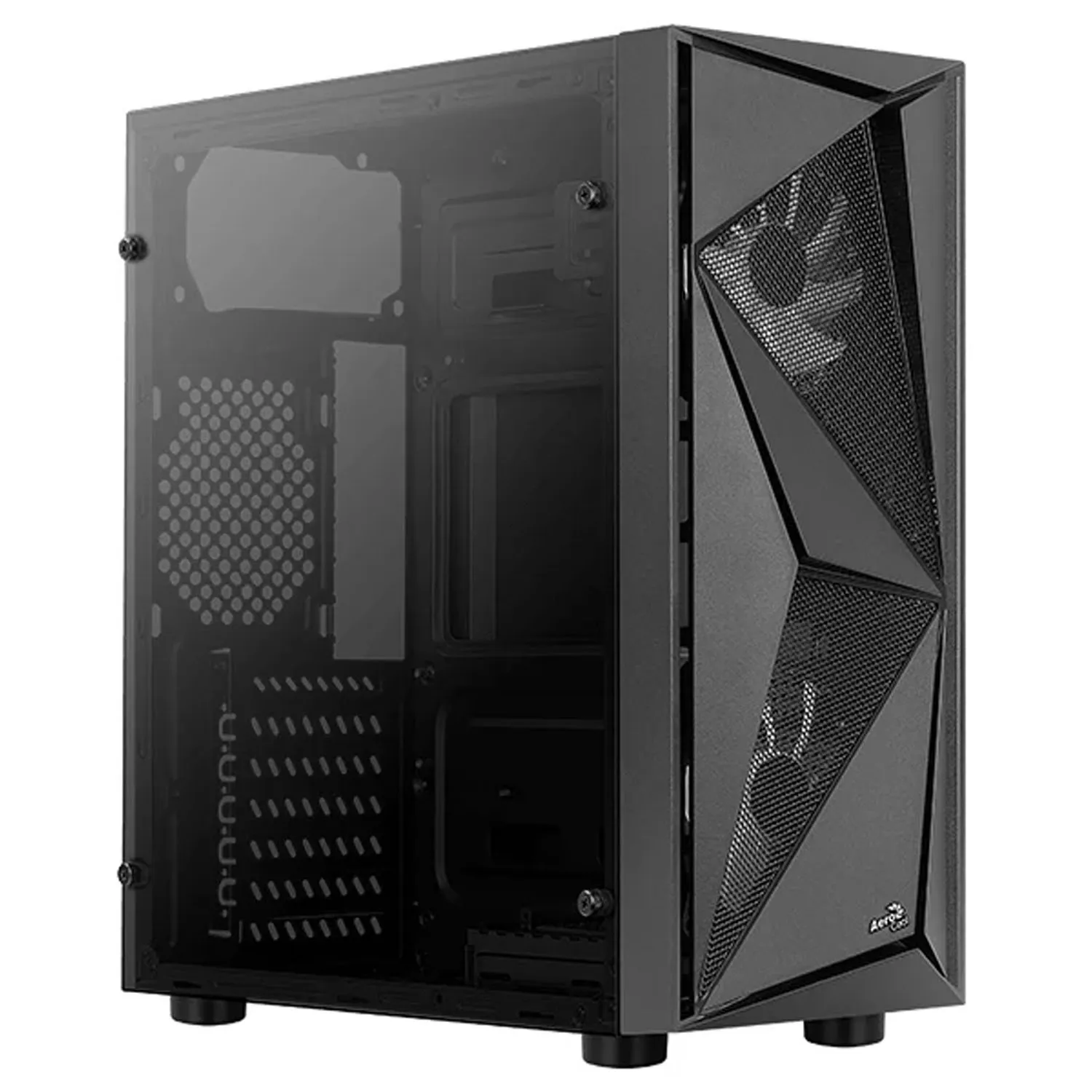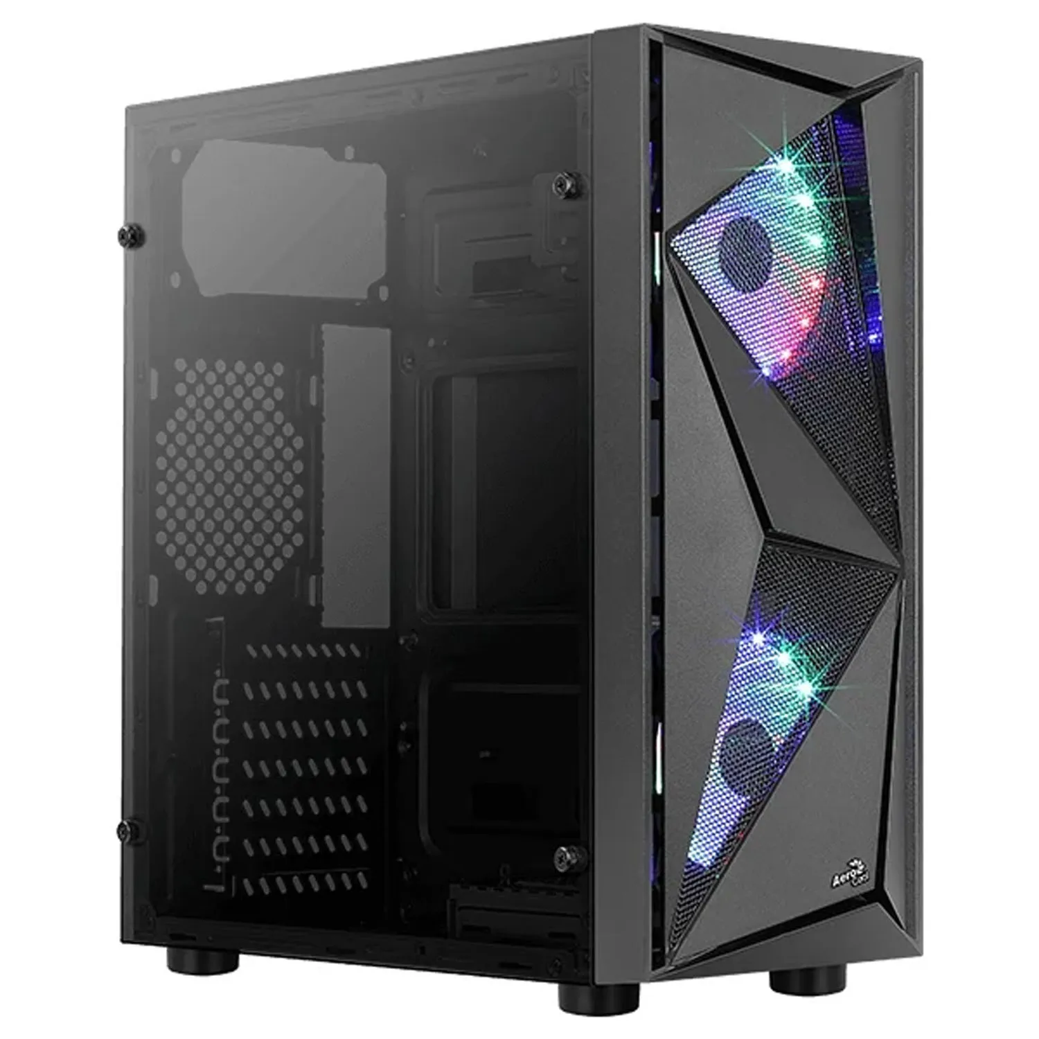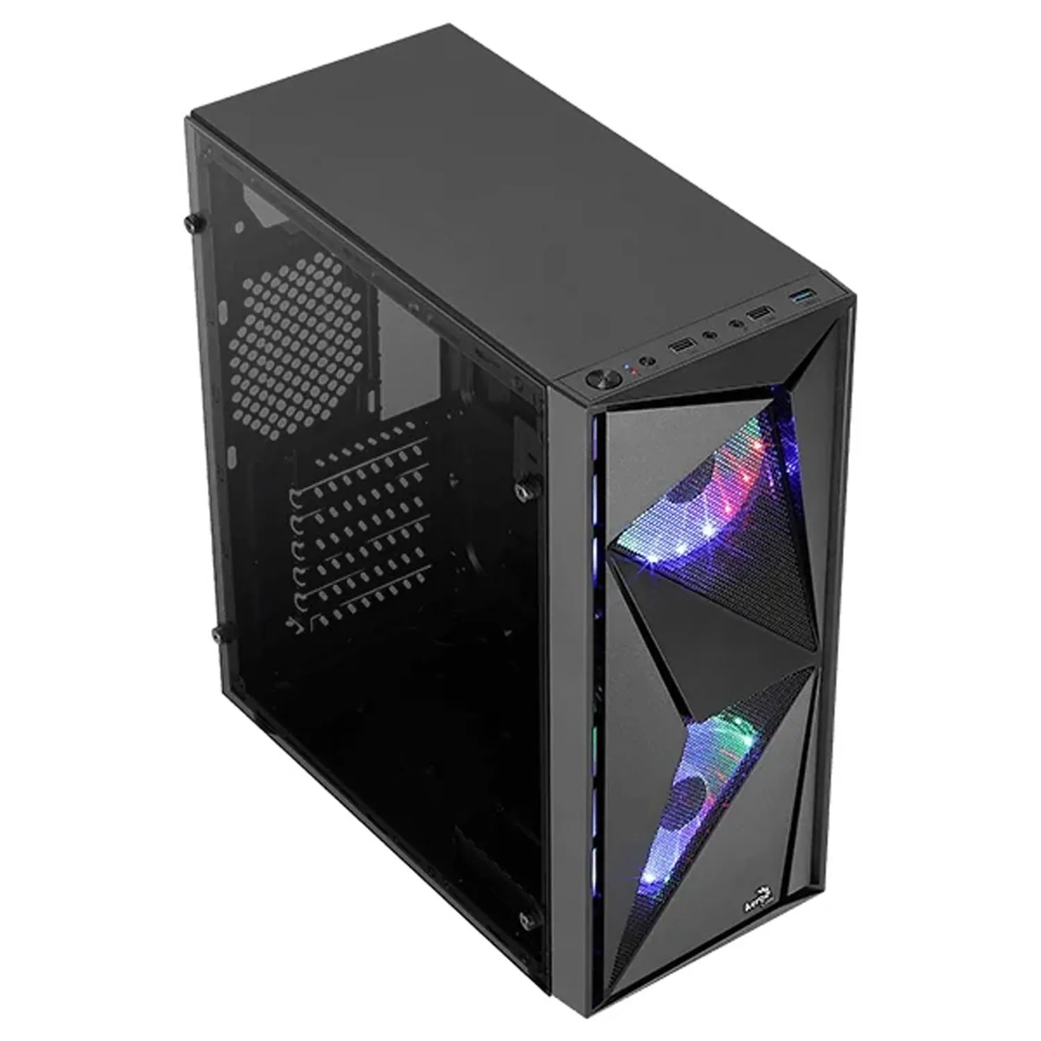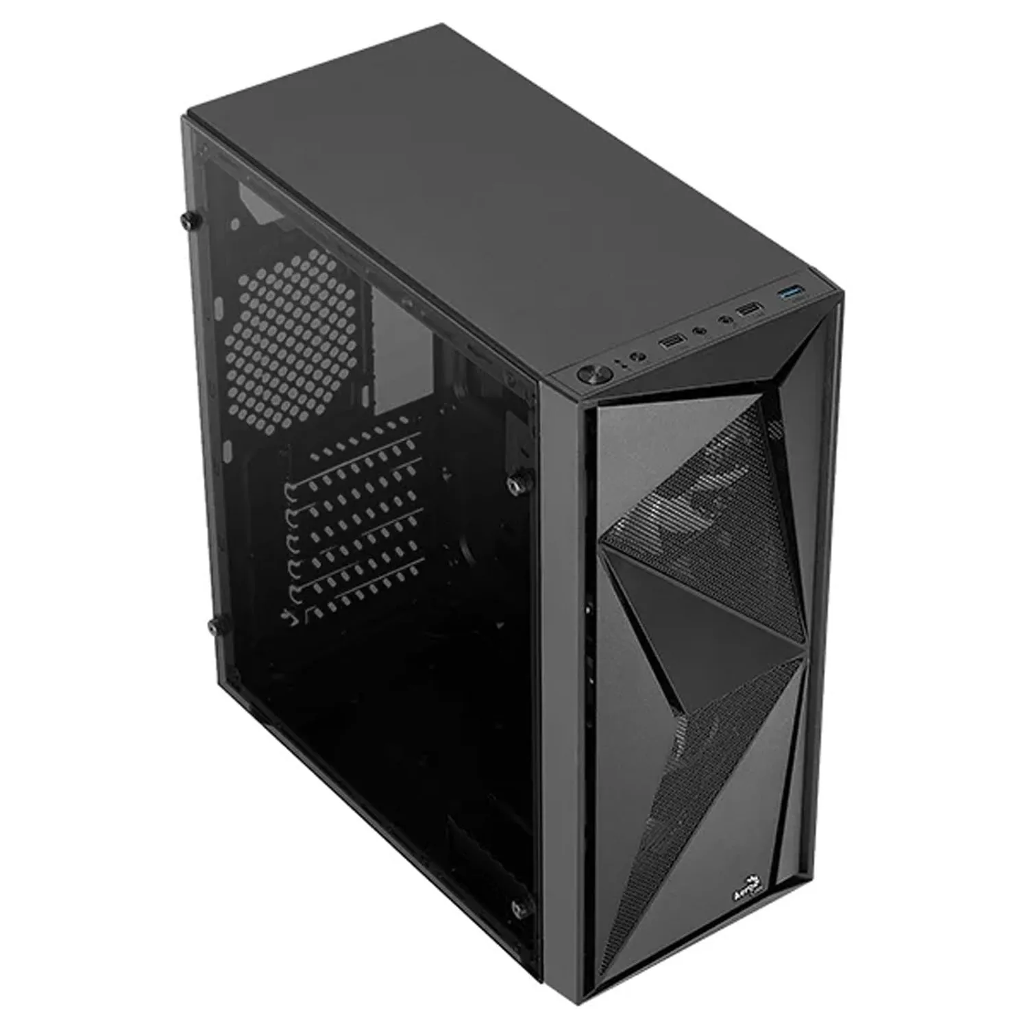 Корпус Aerocool Glider Cosmo создан из качественного стального материала со стеклянными боковыми стенками. В корпусе находится один внутренний отсек для дисков 3,5" и четыре отсека под диск 2.5 дюймов. На передней стороне установлены три интерфейса USB и один 3.0, а также два аудио разъемами. Внизу располагается место для блока питания