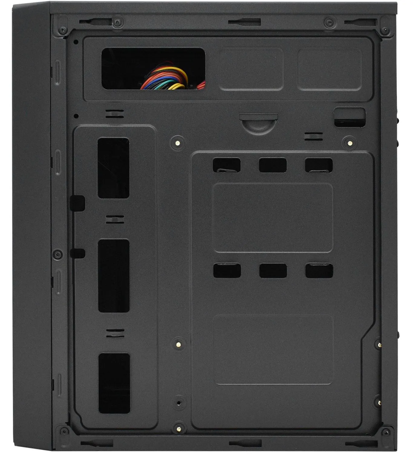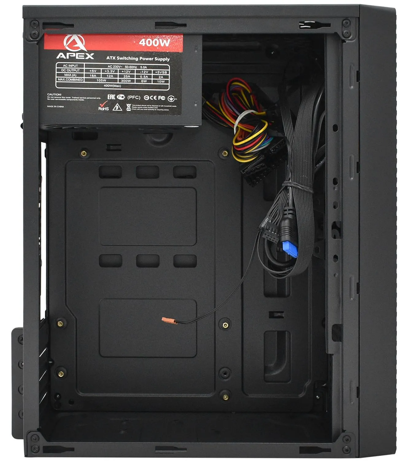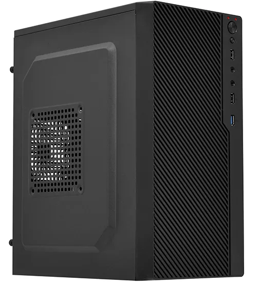 Корпус APEX T04 представляет собой бюджетное решение для сборки офисных или мультимедийных, а также простых игровых персональных компьютеров. Выполнен в формате Mini Tower для установки компактных материнских плат типа Micro-ATX и Mini-ITX. Возможна установка игровой видеокарты с максимальной длиной до 250 мм. Есть возможность установить башенное охлаждение центрального процессора с высотой до 140 мм. Имеется сетчатая передняя панель, что обеспечит хорошую продуваемость и охлаждение комплектующих. Для монтажа дополнительных кулеров предусмотрены крепежные места на передней и боковой стенки с размером 120 мм, на задней – 80 мм. Панель с разъемами имеет 1 USB 3.0 гнездо и 2 USB 2.0, а также входы для аудио устройств, кнопки включения и перезагрузки. Имеется встроенный стандартный блок питания с мощностью 400 Вт и верхним расположением. Смонтированы слоты под размещение двух жестких дисков формата 2.5 или 3.5 дюйма. Выполнен из стали с порошковой окраской черным цветом.