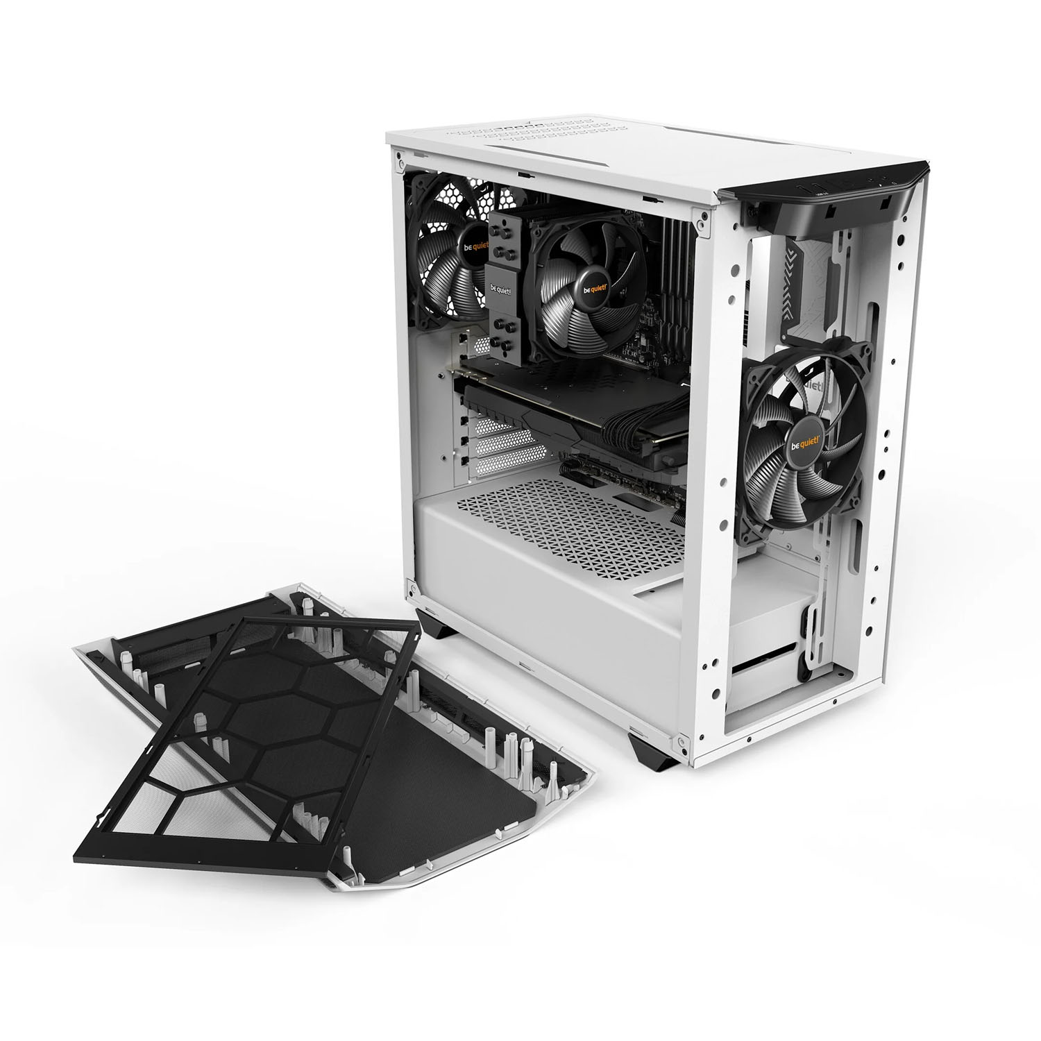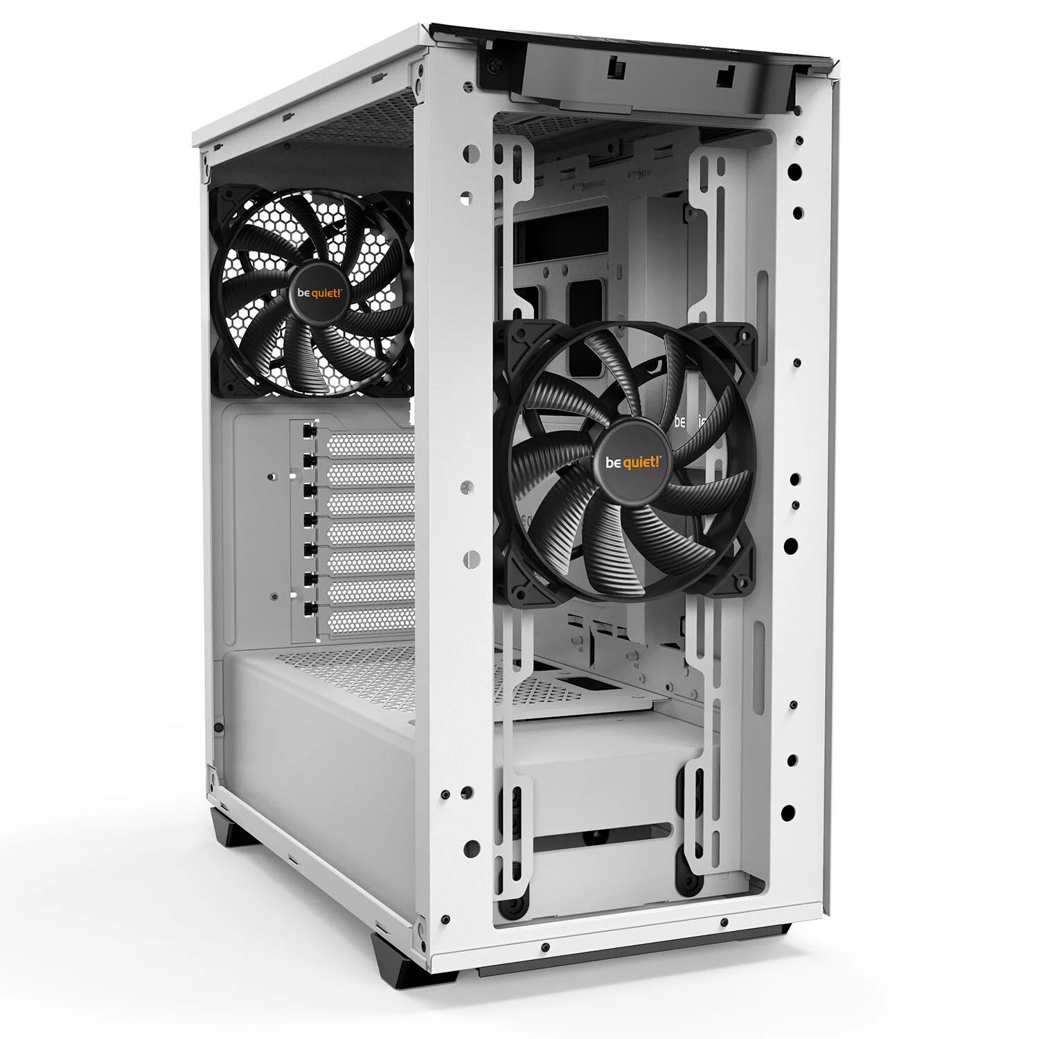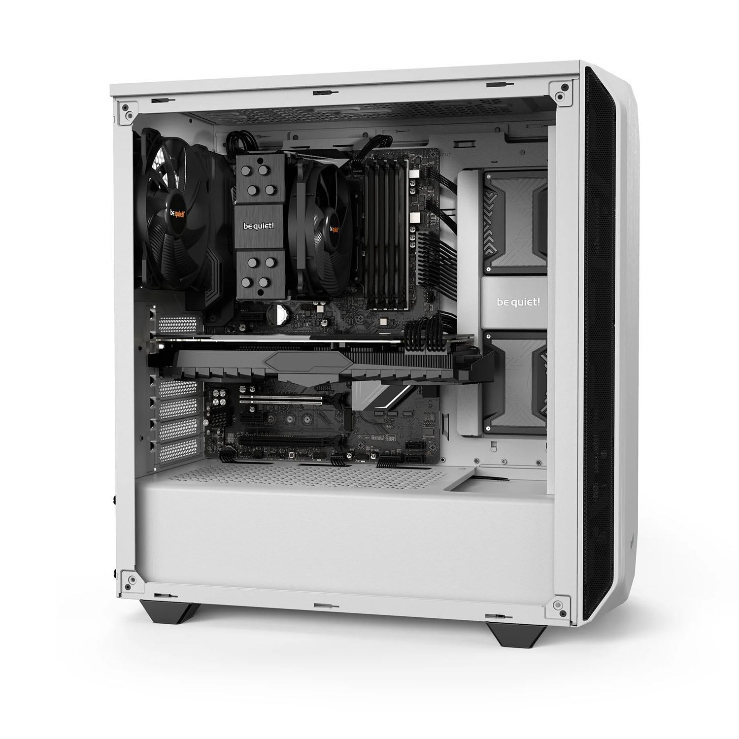 Модель Bequiet! Pure Base 500 White оснащена двумя вентилятора размером 140, есть возможность разместить еще три, а также водяное охлаждение. Боковые стенки являются съемными что дает возможность комфортно устанавливать нужное оборудование. Под блок питания предусмотрено место снизу корпуса.