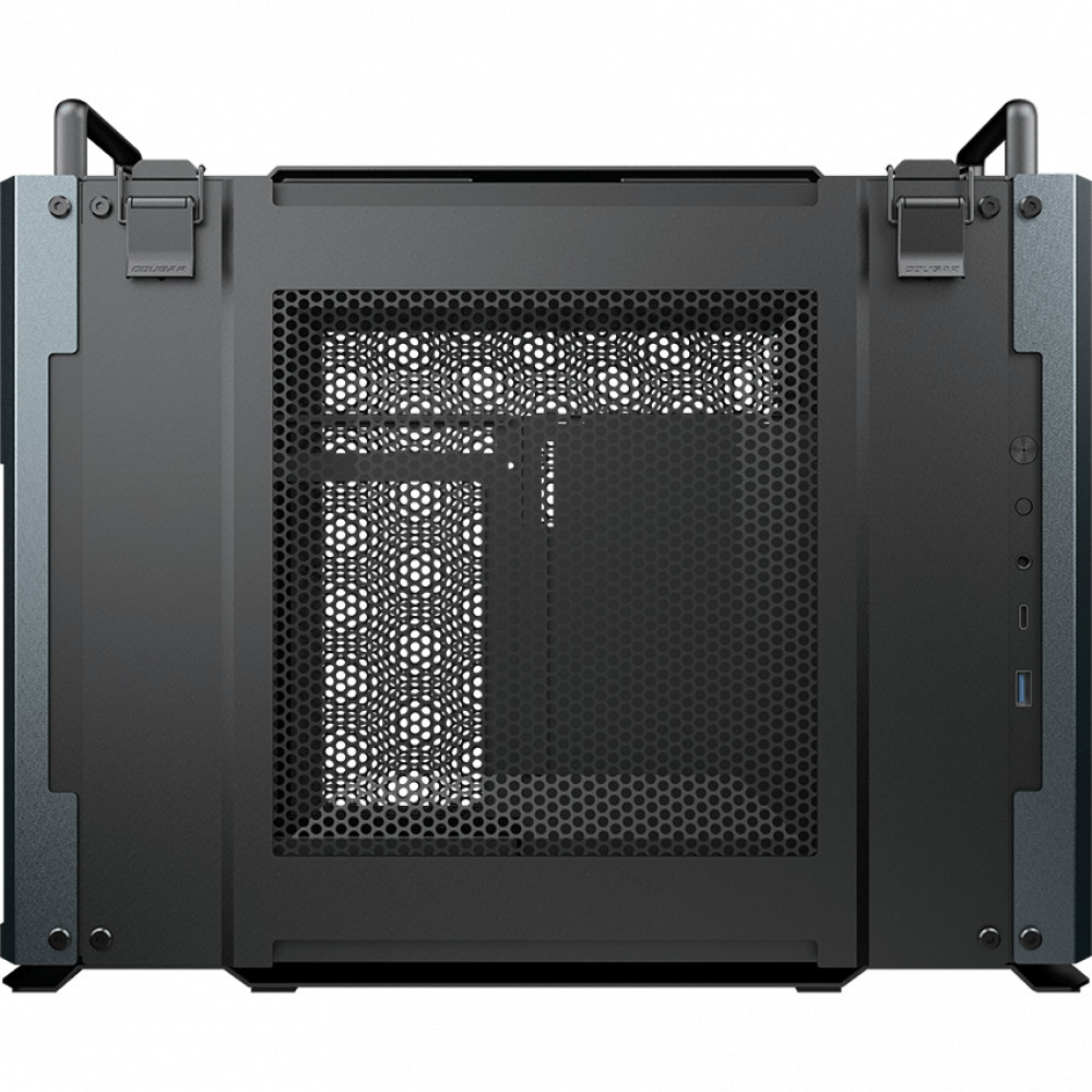 Корпус Cougar Dust 2 при своих небольших размерах выглядит эффектно за счет использования стали и алюминия. Стенки дополнены сетчатыми вставками с перфорированными отверстиями, благодаря которым обеспечивается постоянный приток воздуха для охлаждения нагреваемых элементов. Верхняя панель оснащена двумя массивными ручками, которые удобны для транспортировки и придают модели необычный вид.