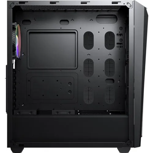 В заднюю часть корпуса встроен вентилятор диаметром 120 мм, оснащенный подсветкой RGB. Есть также место для установки процессорного кулера. Это может быть модель высотой до 165 мм, которую вы сможете подобрать самостоятельно. Для подключения накопителей внутри предусмотрено 2 отделения для устройств в форм-факторе 3,5 дюйма и 7 слотов для подключения накопителей и других устройств размером в 2,5 дюйма. Блок питания в комплектацию к корпусу не входит. Для его установки выделено место в нижней части.