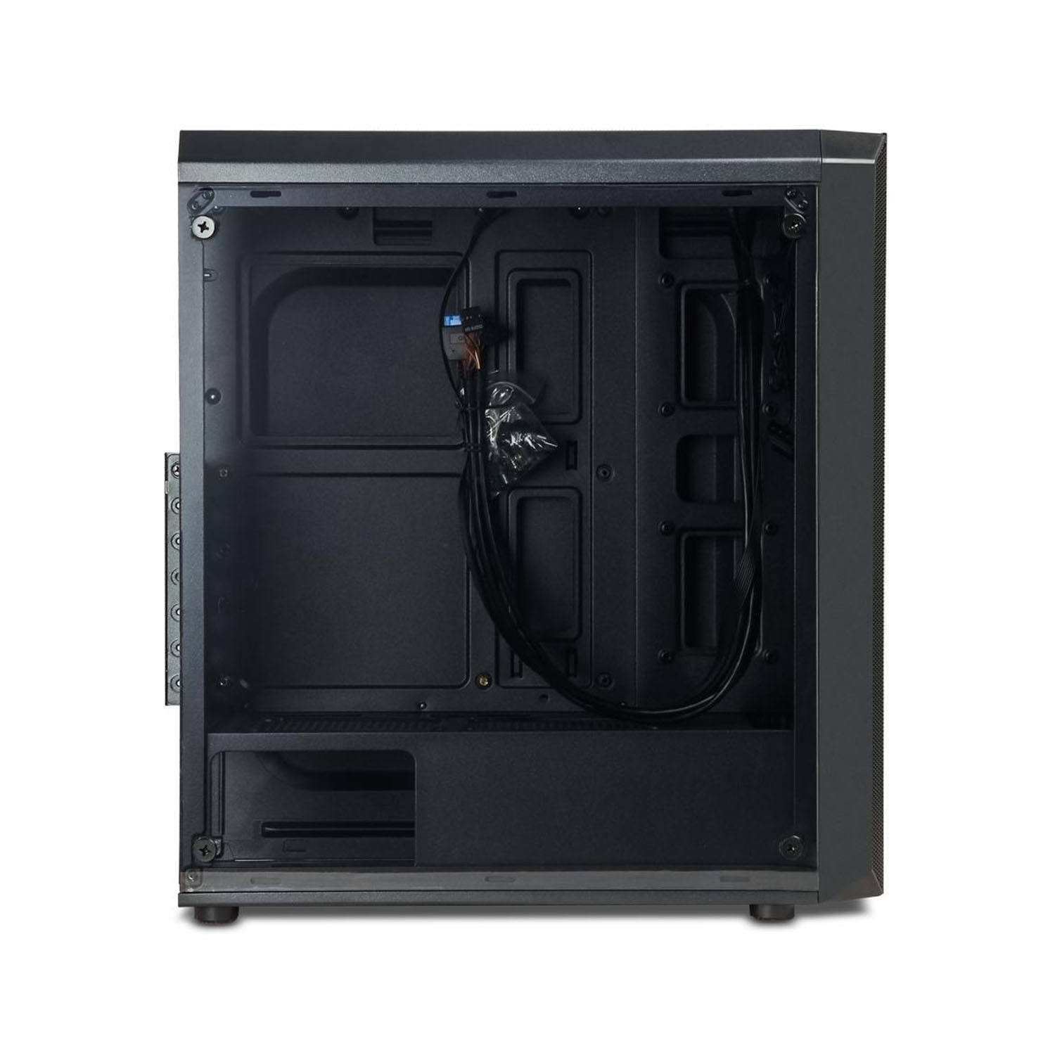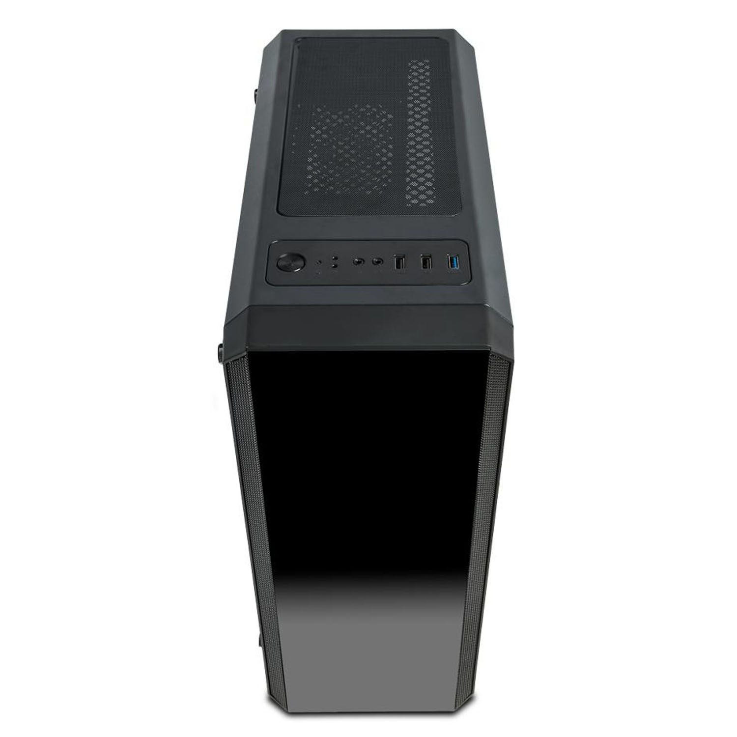 Корпус Delux Atom изготовлен из отличного и прочного стального материала со стеклянными боковыми стенками, в конструкции предусматривает создание воздушных потоков. В корпусе есть пара внутренних отсеков для 3,5" дисков, а также по два отсека для 2.5". На лицевой панели постановлены два USB порта, один вход USB 3.1 и разъемы для аудио выходов. Место для блока питания выполнено внизу. В корпусе находится семь слотов расширения (PCIE) для видеокарты.