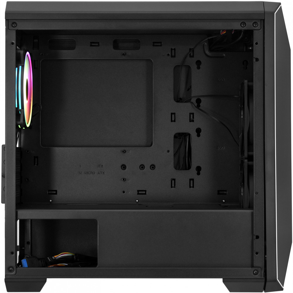 Корпус поставляется с уже установленными тремя вентиляторами. Два вентилятора диаметром 120 мм размещены спереди за сетчатой панелью, третий вентилятор находится сзади и оснащен многоцветной подсветкой. Внутри корпуса есть дополнительные места для размещения вентиляторов. Модель оснащена 4 слотами расширения, 2 отсеками для накопителей в форм-факторе 2,5 дюйма и 1 слотом для накопителей в форм-факторе 3,5 дюйма.