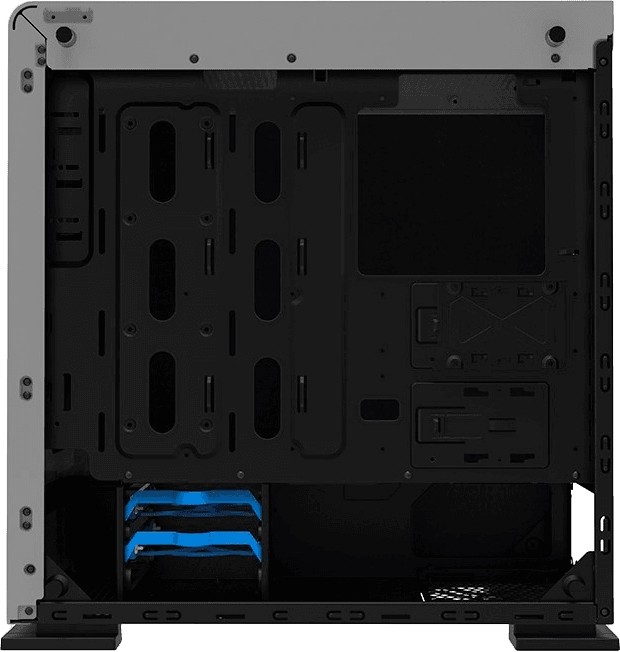 Внутреннее пространство в корпусе тщательно спроектировано. Здесь есть 5 отсеков для установки накопителей в форм-факторе 3,5 дюйма и 4 отсека для накопителей в форм-факторе 2,5 дюйма. Под слоты расширения предусмотрено 7 отверстий. Блока питания приобретается отдельно и устанавливается в специальное отделение в нижней части корпуса.| Артикул | M909 Vega Black Temp Glas |