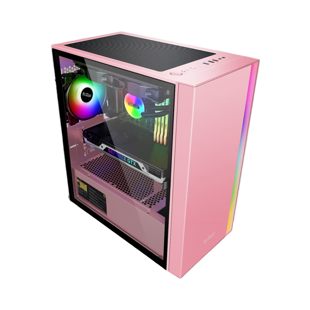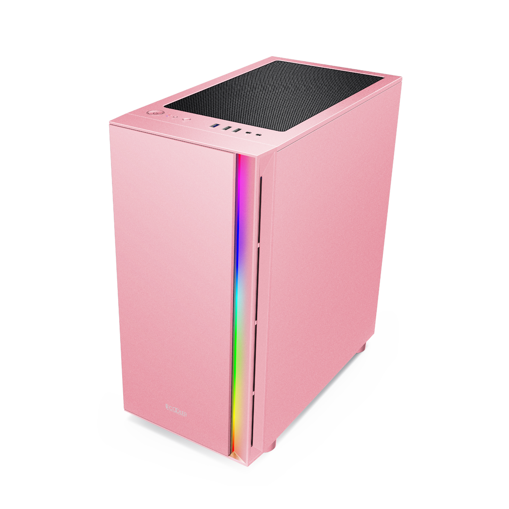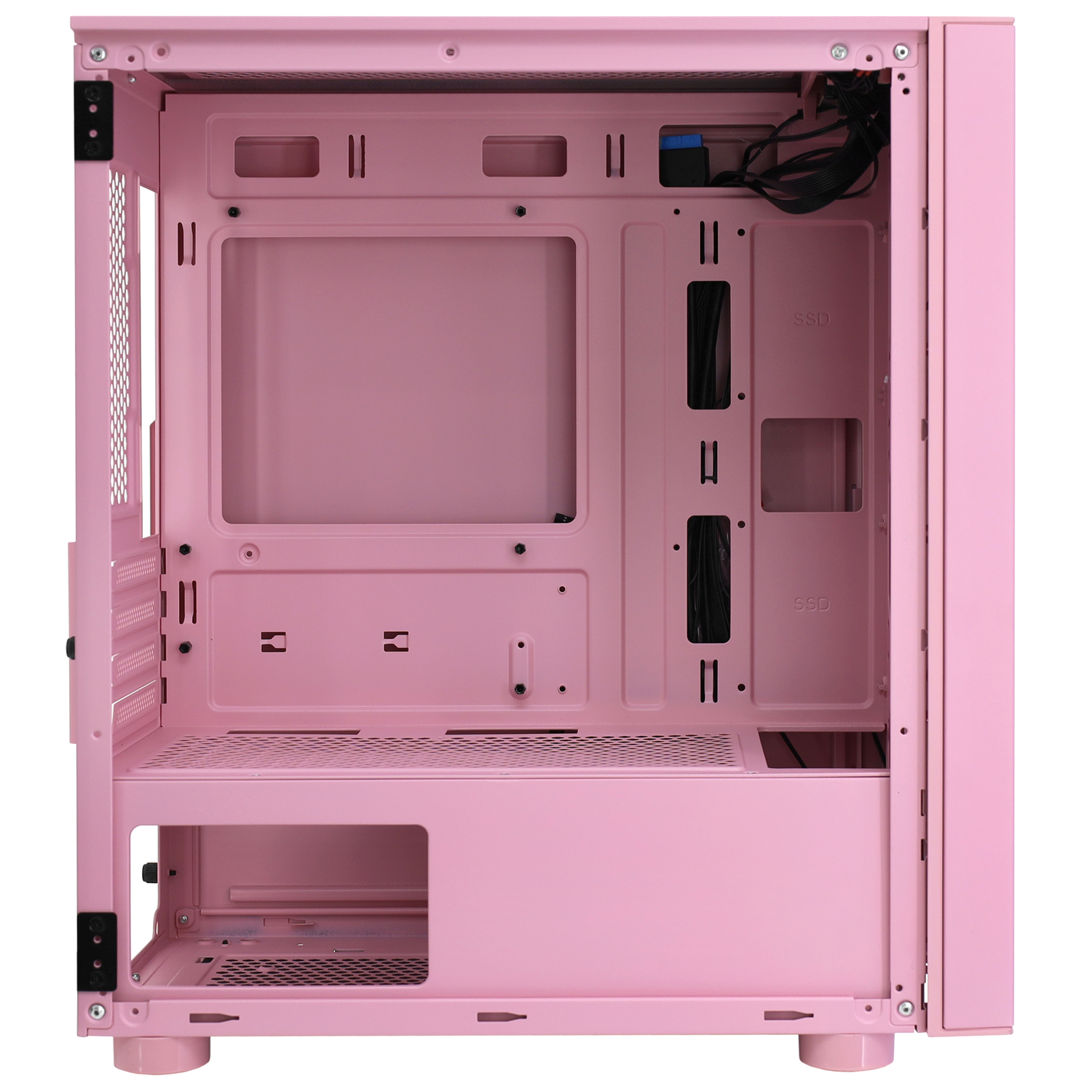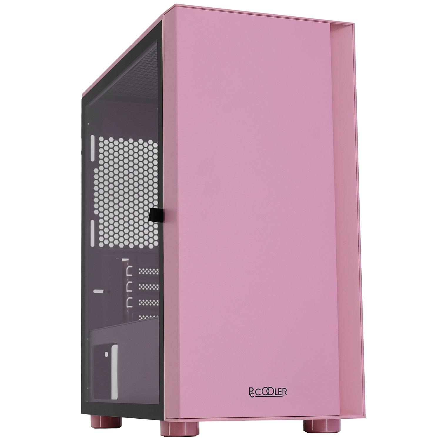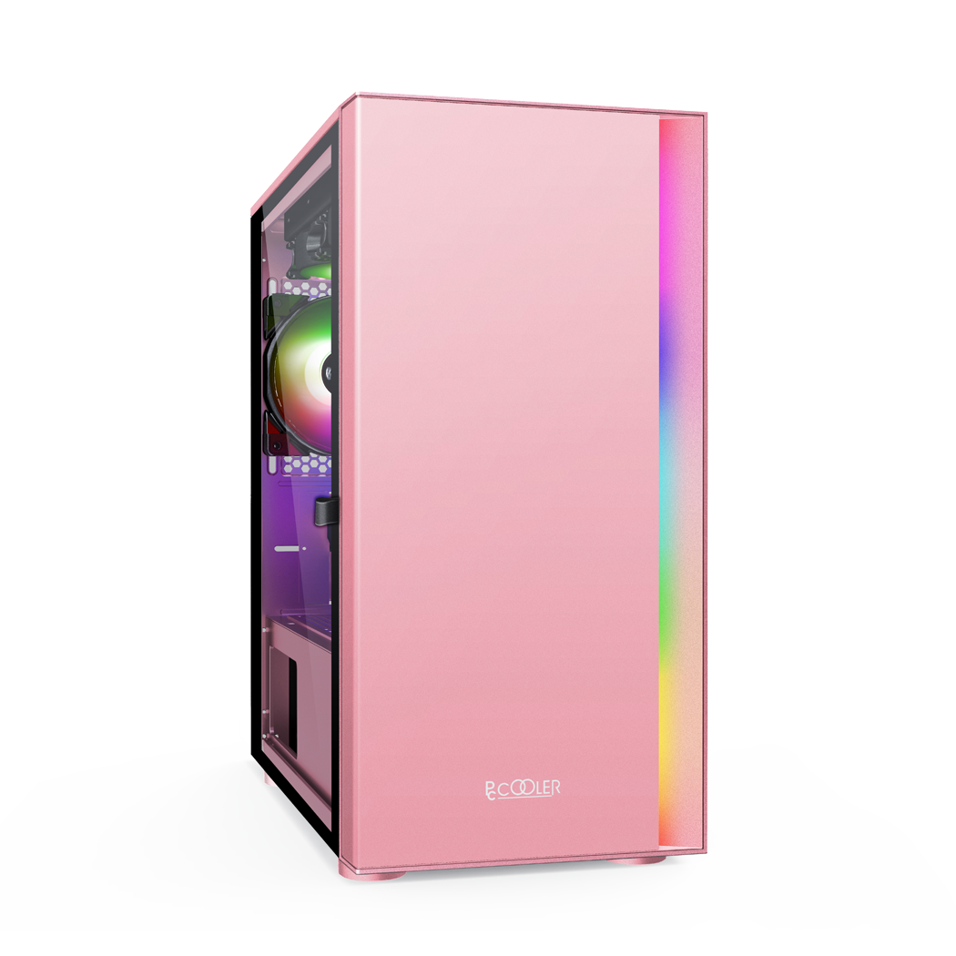 Корпус Pccooler Platinum LM300P ARGB изготавливается из металлического сплава, окрашенного в яркий розовый цвет. Имеется светодиодная лента с несколькими режимами мерцания и цвета. Боковая стеклянная панель оснащена тонировкой. Для накопителей предусмотрены посадочные места для диаметра 3.5 и 2.5 дюйма.
