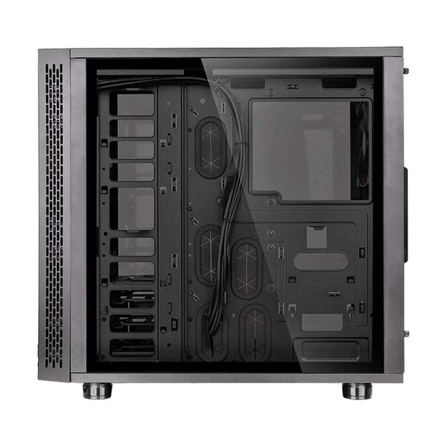 В модели Thermaltake View 31 уже стоит два кулера размером 140 мм, дополнительно можно вставить еще три 140 и два 200, а также водяное охлаждение. За счет боковых съемных стенок можно легко поставить любые комплектующие. Под блок питания предусмотрено место внизу корпуса.