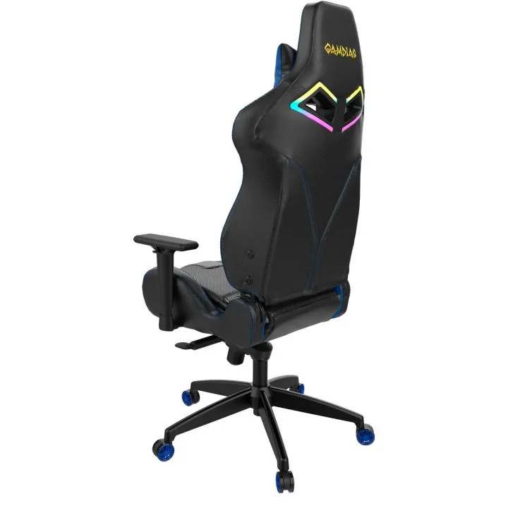 Игровое кресло Gamdias ACHILLES M1A L BB Blue изготавливается из прочной стали, выдерживающей вес до 150 кг. Пятилучевое основание содержит прорезиненные колеса, что предохраняет напольное покрытие от механических повреждений. Газлифт позволяет регулировать высоту сидения, а механизм спинки – регулировать наклон от 65 до 135 градусов. Обивка кресла черно-синего цвета изготовлена из экологичной искусственной кожи, имеется разноцветная светодиодная подсветка.
