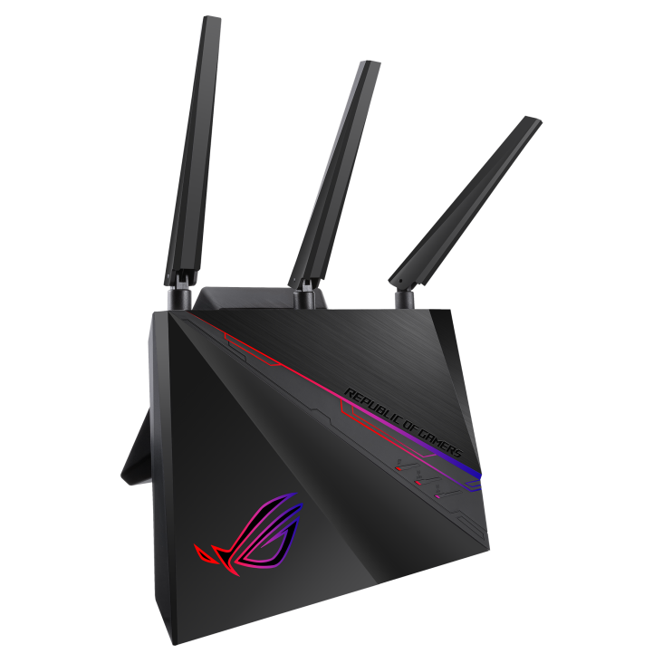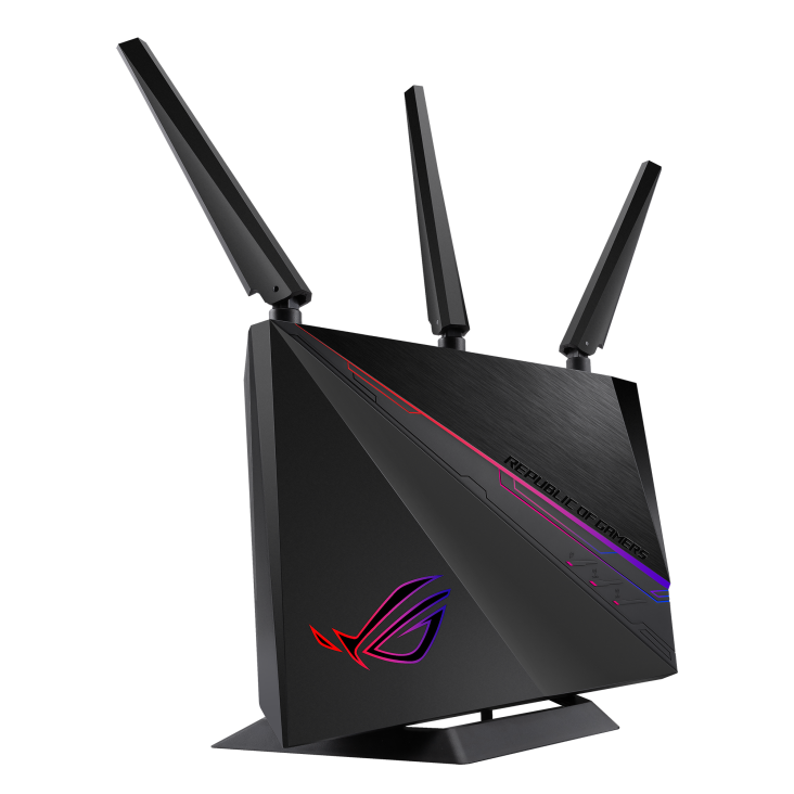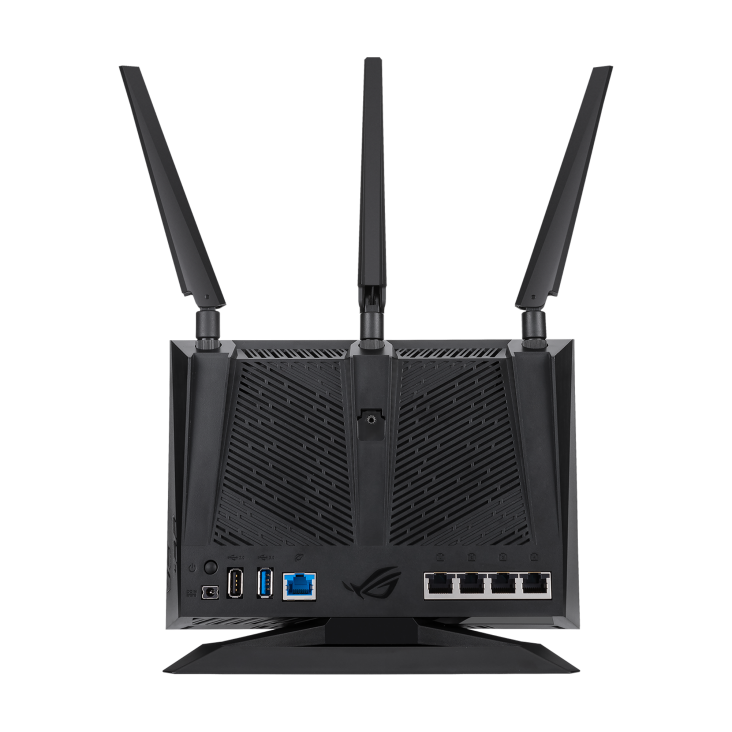 Роутер Asus GT-AC2900 выполнен в надежном пластиковом корпусе с тремя антеннами и подставкой для вертикальной установки. Для проводных подключений NAS, телевизоров и прочих устройств имеются 5 разъемов RJ45 с максимальной скоростью передачи данных в 1 Гбит/с. Для быстрого развертывания сети имеется кнопка WPS. Также поддерживает технологию направленного радиолуча Beamforming для увеличения области действия.