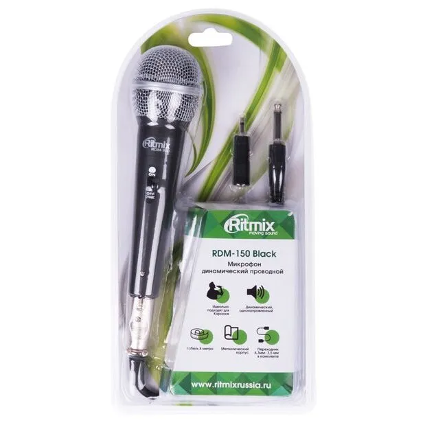 Микрофон Ritmix RDM-150 станет отличным решением для организации караоке дома или на выездных мероприятиях. Вы сможете спеть любимую песню и весело провести время в компании. Микрофон можно использовать и начинающим для занятий вокалом. Модель отличается простой, но прочной конструкцией благодаря корпусу из металла. Подключение устройства к источнику производится с помощью кабеля длиной 4 метра с коннектором 3.5 мм, который подходит к большинству интерфейсов техники. Переходник с 6.3 мм на 3.5 мм входит в комплектацию.