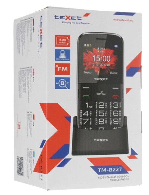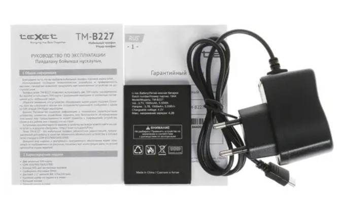 | Комплектация | Мобильный телефон Texet TM-B227 красный / Аккумуляторная батарея - 1 шт. / Зарядное устройство - 1 шт. / Подставка для зарядки - 1 шт. / Документация |