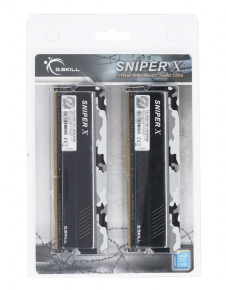 Комплект оперативной памяти G.Skill Sniper X 2x8Gb изготовлен в стильном современном дизайне, содержит низкопрофильные радиаторы, окрашенные в темный камуфляжный цвет. Подразумевает установку в слот DDR4 DIMM большинства материнских плат. Работает с общей скоростью обмена данными в 25600 Мбайт/с, а также со схемой задержек 16-18-18-38. Использует стандартное напряжение 1.35 В.