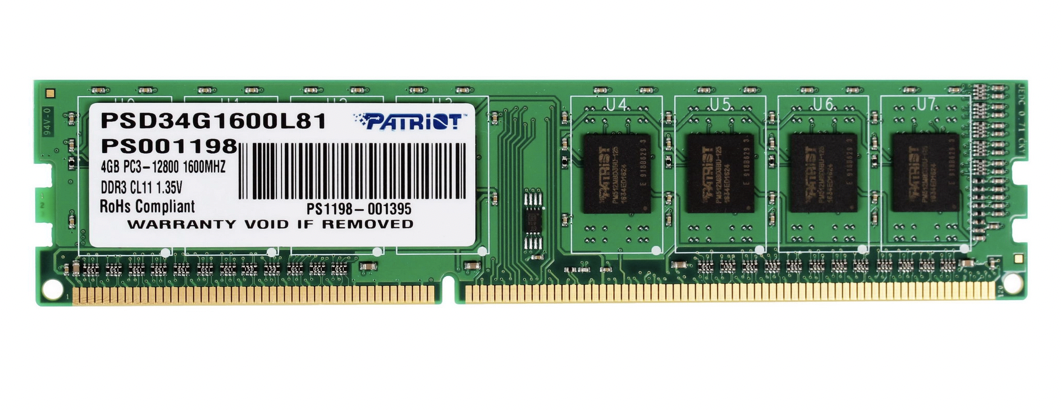 Модуль оперативной памяти Patriot PSD34G1600L81 4GB выполнен в полноразмерном одноранговом и односторонним формате. Поддерживает установку на материнские платы со стандартным интерфейсом UDIMM DDR3. Суммарная пропускная способность чипов составляет 12800 Мбайт/с, а тайминги – 11-11-11 при уровне латентности CL11. Работает под напряжением 1.35 В. Не является регистровым и не поддерживает серверную коррекцию ошибок.