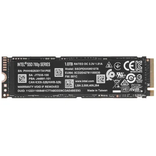 Твердотельный накопитель Intel 760p с емкостью для хранения данных в 1 ТБ разработан для ПК и выполняет функцию долговременного хранения файлов и программ. Устройство с такой емкостью вмещает большое количество фото и видео файлов, личных и рабочих данных. Использование накопителя в качестве хранилища данных имеет несколько преимуществ: повышается производительность всей системы, ускоряется запуск программ и взаимодействие с файлами. Это возможно за счет высокой скорости чтения и записи данных, которые имеют показатели в 3230 Мб/с и 1620 Мб/ссоответственно.