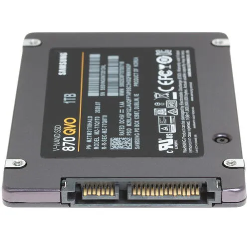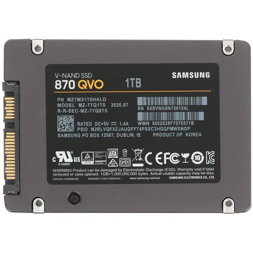 SSD диск Samsung 870 Qvo 1000 GB представляет собой надежное и производительное устройство верхнего ценового сегмента. Предназначен для увеличения производительности современных и устаревших компьютерных системных блоков, лэптопов и моноблоков. Позволяет размещать различные файловые архивы, музыкальные коллекции, фотографии, дистрибутивы программных комплексов. Обладает ёмкостью ячеек в 1000 Гб, чего достаточно для периодического резервного копирования. Поддерживает чтение данных на 560 Мб/с, а также запись на 530 Мб/с. Использует стандарт SATA 3 с максимальной скоростью обмена в 6 Гбит/с. Ускоряет загрузку системы и повышает частоту кадров в видеоиграх с открытым миром.