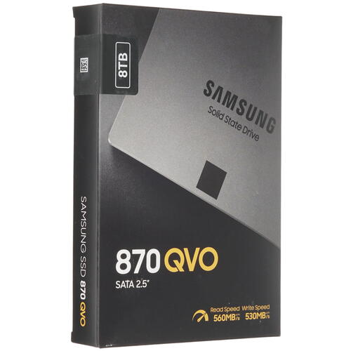 SSD накопитель Samsung 870 QVO в значительной мере увеличивает производительность и эффективность, при эксплуатации в качестве дополнения в мощных игровых компьютерах и сложных технологических системах. Устройство оборудовано высокопроизводительным контроллером Samsung MKX. 8000 Гб памяти позволяют надежно хранить большое количество необходимой информации.Трехмерная 3D NAND структура памяти делает эксплуатацию более надежной, а рыночную стоимость значительно ниже. Модель представлена со встроенным физическим интерфейсом SATA3, обеспечивающем передачу максимальной скорости записи и чтения, составляющей 530 Мб/с и 560 Мб/с. Корпус устройства выполнен из износостойких и прочных материалов, обеспечивающих максимальную ударостойкость в 1500 G, что значительно увеличивает срок службы накопителя.