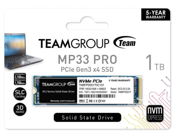 SSD диск Team Group MP33 PRO 1TB изготавливается в стандартном формате NVME 1.3 и подразумевает установку в слот М.2 с интерфейсом передачи данных PCI-E 3.0 4x. Обладает ресурсом, обеспечивающим стабильную работу в течение 2 млн. часов. Защищен от вибрационных и ударных нагрузок до 1500 G, не содержит движущегося механизма. Предоставляется пятилетняя гарантия.