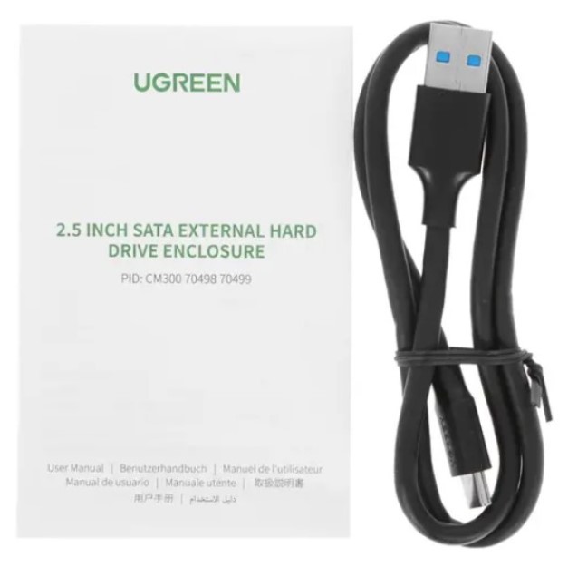| Комплектация | Кейс для SSD/HDD Ugreen CM300 2.5'' SATA External Hard Drive Enclosure with USB C To USB C cable / Кабель USB Type-A - Type-C - 1 шт. / Документация |