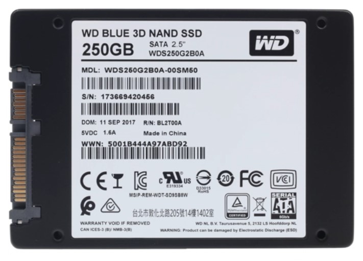 SSD диск Western Digital Blue 250GB изготавливается в небольшом классическом корпусе из пластикового полимера, окрашенного в черный цвет. Не содержит движущегося механизма, что повышает устойчивость к вибрациям и тряске. Выполнен в формате 2.5 дюйма. Для подключения к системной плате предусмотрен интерфейс SATA 3 с предельной скоростью обмена в 6 Гбит/с.
