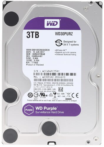 Жесткий диск Western Digital Purple с внушительной емкостью для записи данных в 3 ТБ разработан для использования в системах видеонаблюдения. Модель отличается высокой надежностью работы и подходит для использования в системах, непрерывно работающих в режиме 24/7. Благодаря использованию уникальных разработок в этом диске сведено к минимуму количество ошибок, ведущих к искажению видео и перебоям в записи. Устройство может поддерживать запись данных с 64 HD камер одновременно.