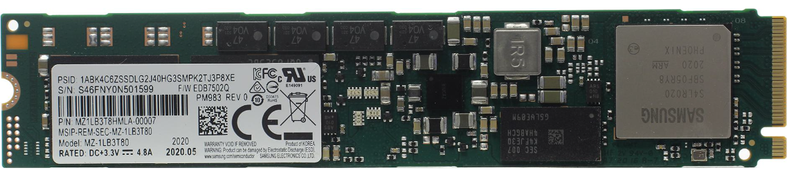 SSD диск Samsung PM983 3.84Tb создан с небольшими размерами. Выполнен на компактной печатной плате. Устанавливается в серверные шасси. Необходим свободный порт М.2 на системной плате. Предусмотрена возможность записи данных на скорости до 1400 Мб/с, чтения – на 3000 Мб/с. Максимальный ресурс перезаписи составляет 5464 TWB.