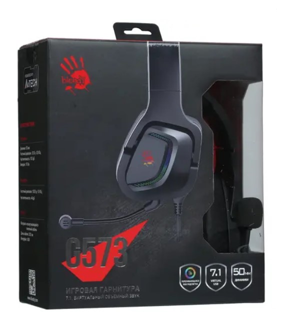 Гарнитура A4Tech Bloody G573 изготавливается с корпусом из пластикового полимера. Окрашена в матовый черный цвет. Интегрирована контурная светодиодная подсветка. Уровень внутреннего сопротивления изделия составляет 16 Ом. Имеется надежный кабель с длиной 2 метра и качественной тканевой оплеткой. Подключается к системным платам компьютеров, моноблоков и лэптопов по классическому интерфейсу USB 2.0.