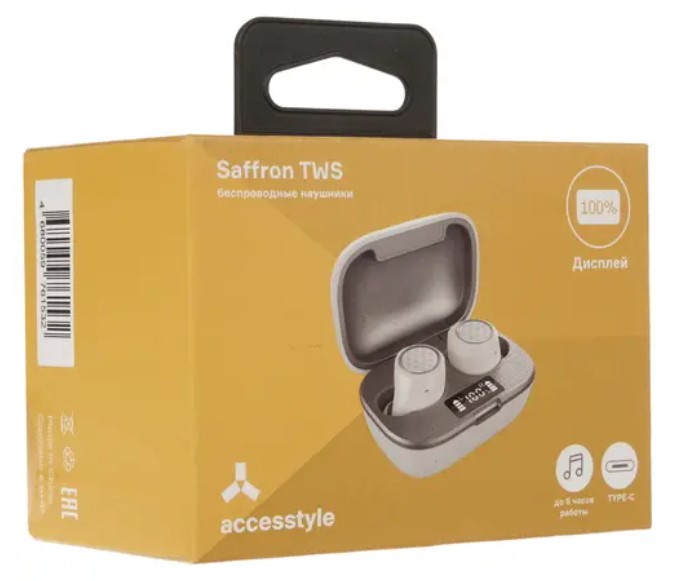 | Комплектация | Беспроводные наушники Accesstyle Saffron TWS белый / Кабель питания - 1 шт. / Комплект сменных амбюшор - 1 шт. / Документация |