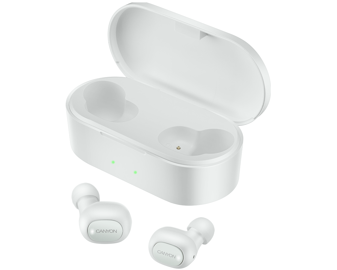 Наушники Canyon TWS-2 белого цвета представляют собой удобные небольшие наушники-вкладыши, которые подключаются к смартфону или планшету с помощью беспроводного соединения Bluetooth. Радиус действия этого соединения составляет 10 метров – вы сможете положить в сумку или карман одежды устройство и слушать музыку, общаться по телефону и оставаться на связи. В корпусе наушников есть микрофон, благодаря которому вы сможете принимать входящие звонки.