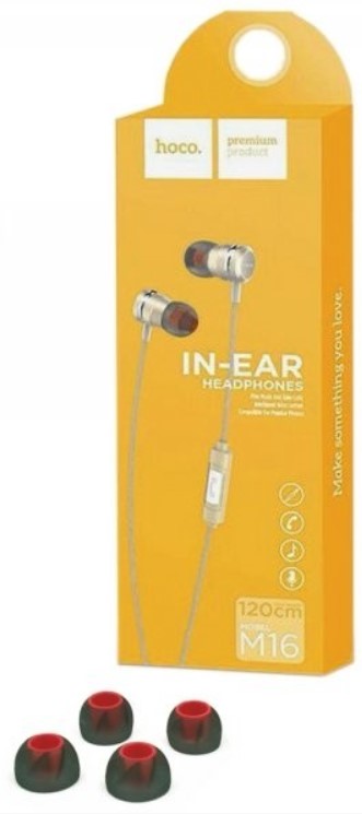| Комплектация | Гарнитура Hoco M16 золото / Комплект сменных амбюшор - 1 шт. / Документация |